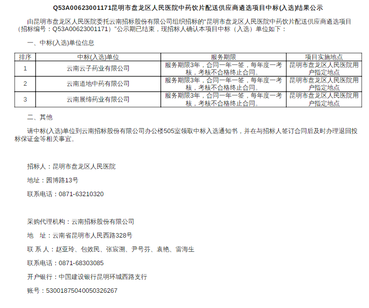 【昆明市盘龙区人民医院】云南省昆明市盘龙区人民医院中药饮片配送供应商遴选项目招标结果公告