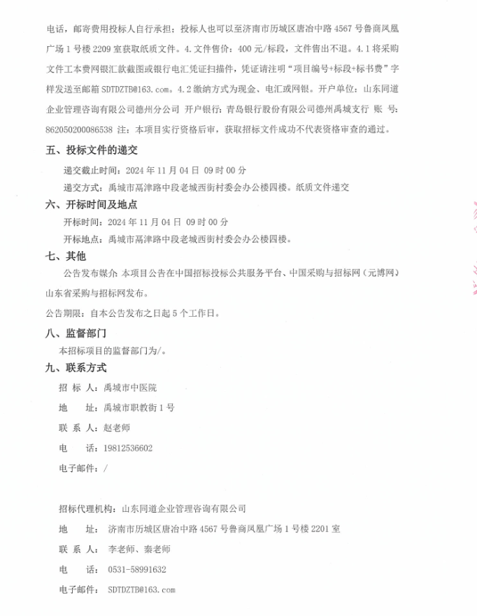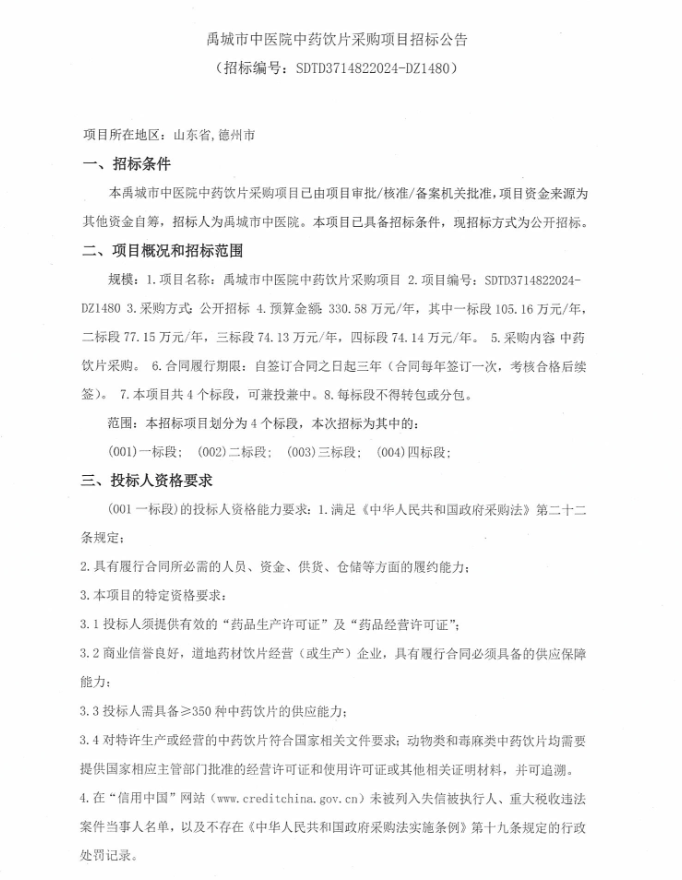 【德州市禹城市中医院】山东省德州市禹城市中医院中药饮片采购项目招标公告