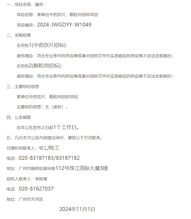【军队采购】军队采购网采购中药饮片、中药颗粒剂采购结果公示(2024-JWGDYY-W1049)(第1、2包)