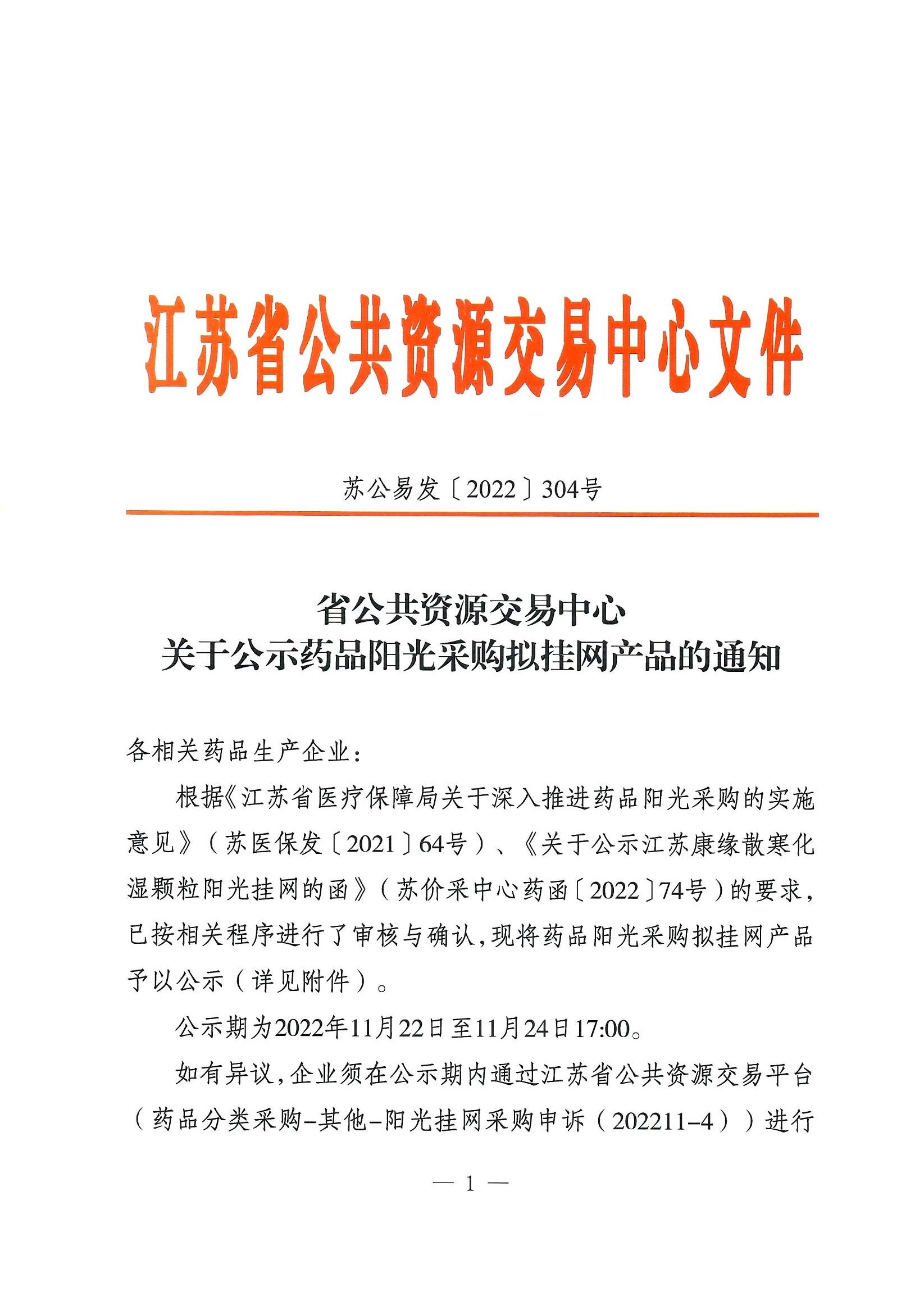 根据《江苏省医疗保障局关于深入推进药品阳光采购的实施意见》(苏医保发〔2021〕64号)、《关于公示江苏康缘散寒化湿颗粒阳光挂网的函》(苏价采中心药函〔2022〕74号)的要求,已按相关程序进行了审核与确认,现将药品阳光采购拟挂网产品予以公示(详见附件)。