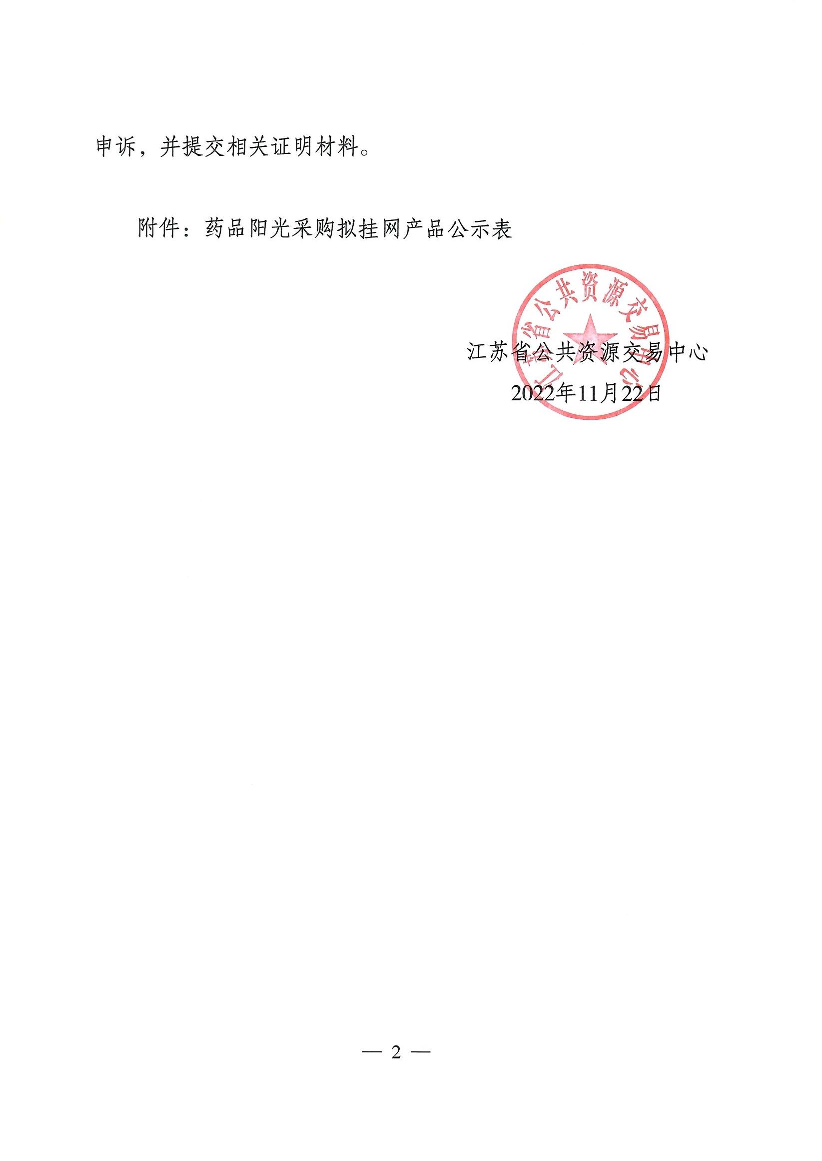 如有异议,企业须在公示期内通过江苏省公共资源交易平台(药品分类采购-其他-阳光挂网采购申诉(202211-4))进行申诉,并提交相关证明材料。