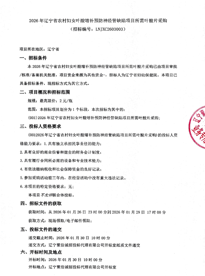 【辽宁省妇幼保健院】2026年辽宁省农村妇女叶酸增补预防神经管缺陷项目所需叶酸片采购