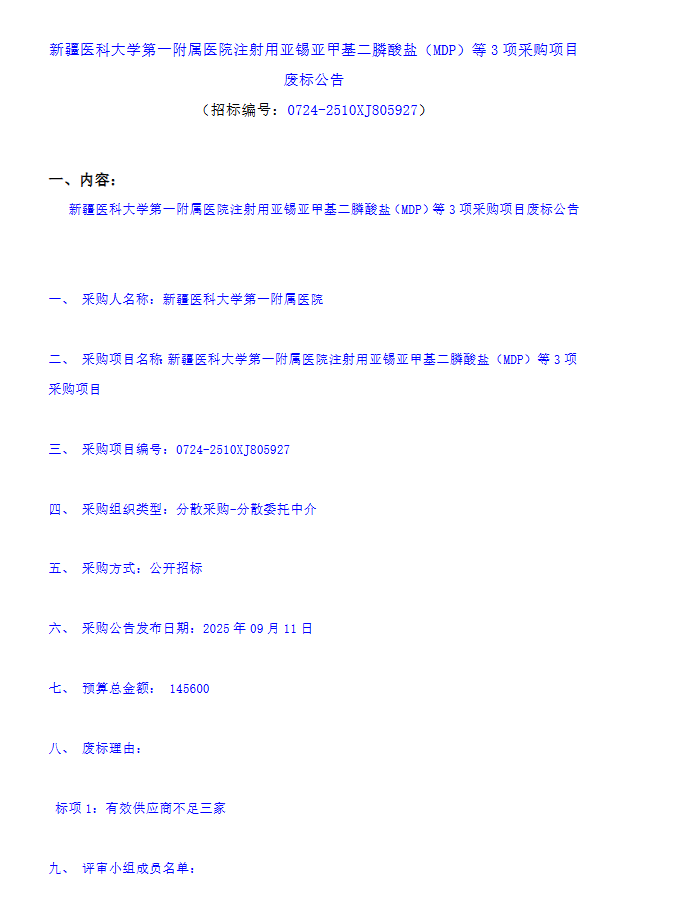 【新疆医科大学第一附属医院】新疆维吾尔自治区新疆医科大学第一附属医院注射用亚锡亚甲基二膦酸盐(MDP)等3项采购项目废标公告