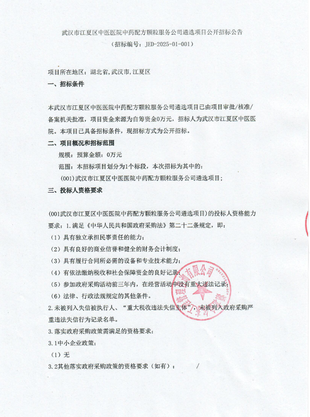 【武汉市江夏区中医医院】湖北省武汉市江夏区中医医院中药配方颗粒服务公司遴选项目公开招标公告
