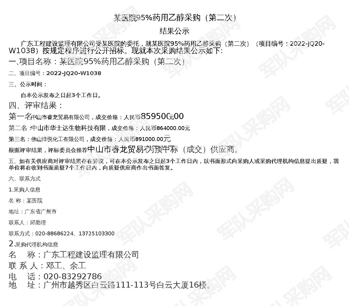 【军队采购】军队采购网某医院95%药用乙醇采购(第二次) 结果公示(2022-JQ20-W1038)