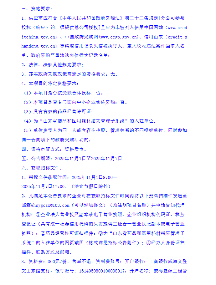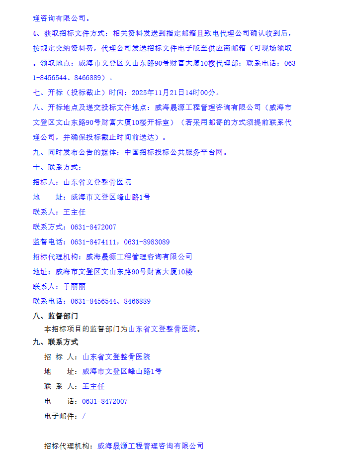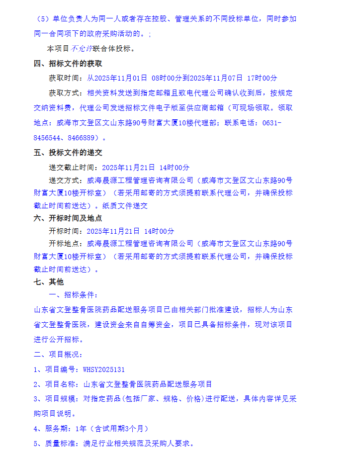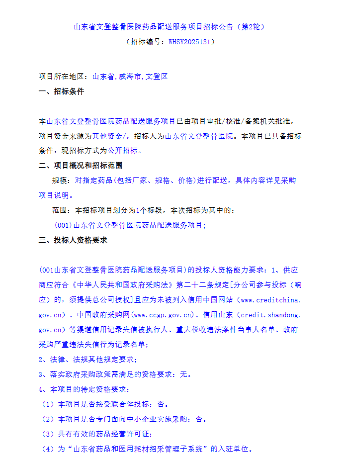 【山东省文登整骨医院】山东省文登整骨医院药品配送服务项目招标公告(第2轮)
