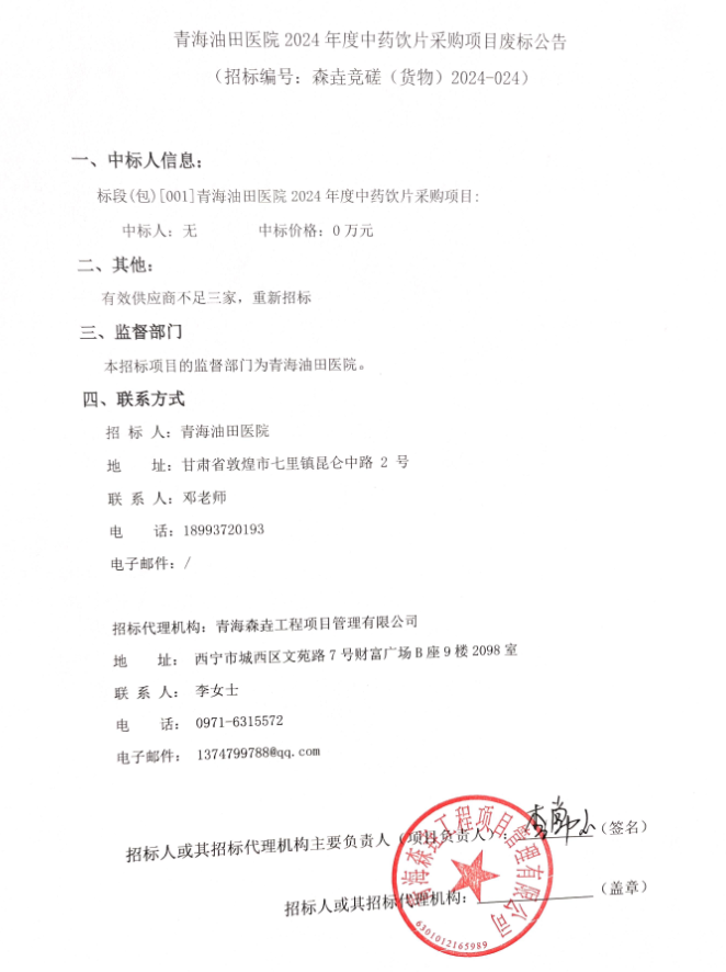 【酒泉市敦煌市青海油田医院】甘肃省酒泉市敦煌市青海油田医院2024年度中药饮片采购项目废标公告
