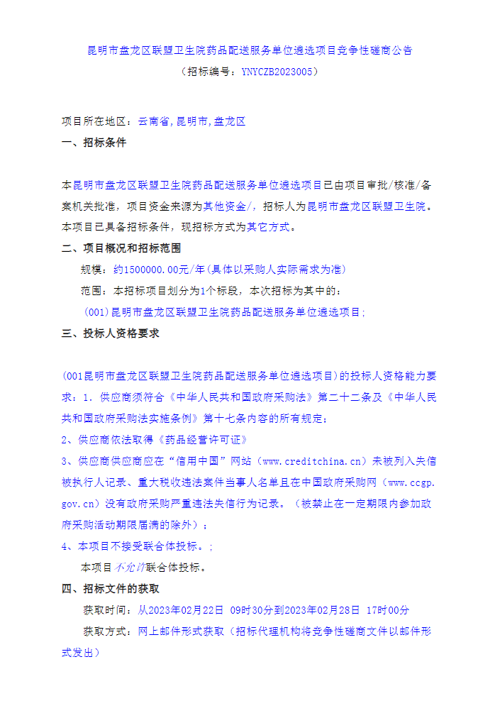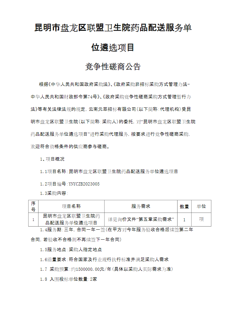 【昆明市盘龙区联盟卫生院】云南省昆明市盘龙区联盟卫生院药品配送服务单位遴选项目竞争性磋商公告