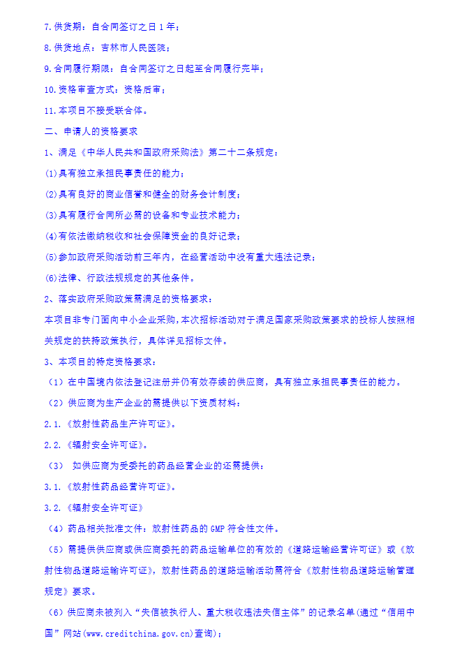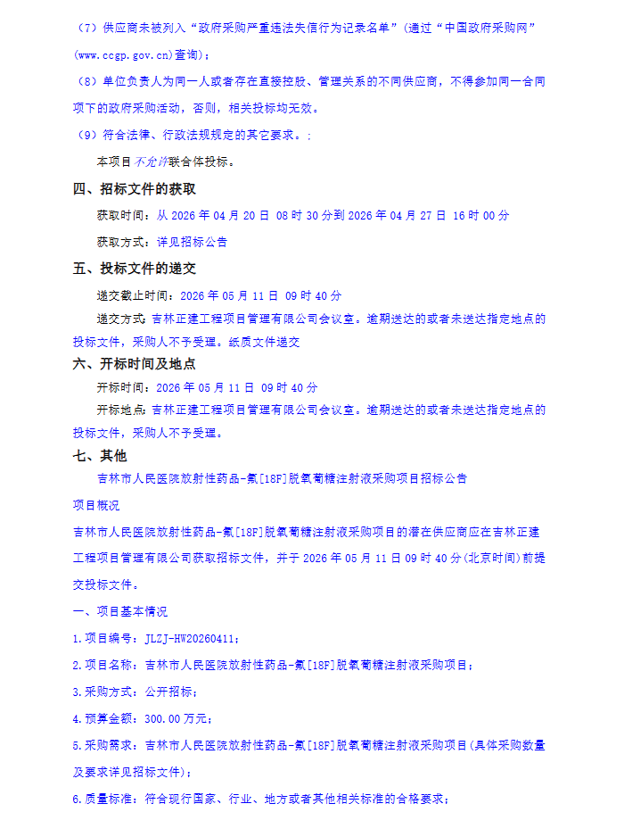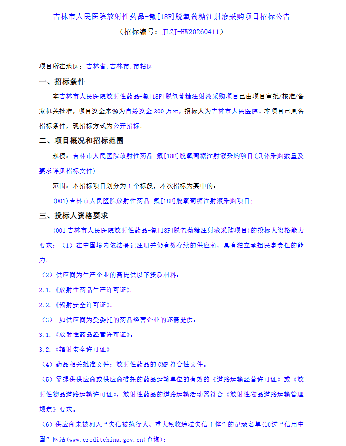 【吉林市人民医院】吉林省吉林市人民医院放射性药品-氟[18F]脱氧葡糖注射液采购项目招标公告