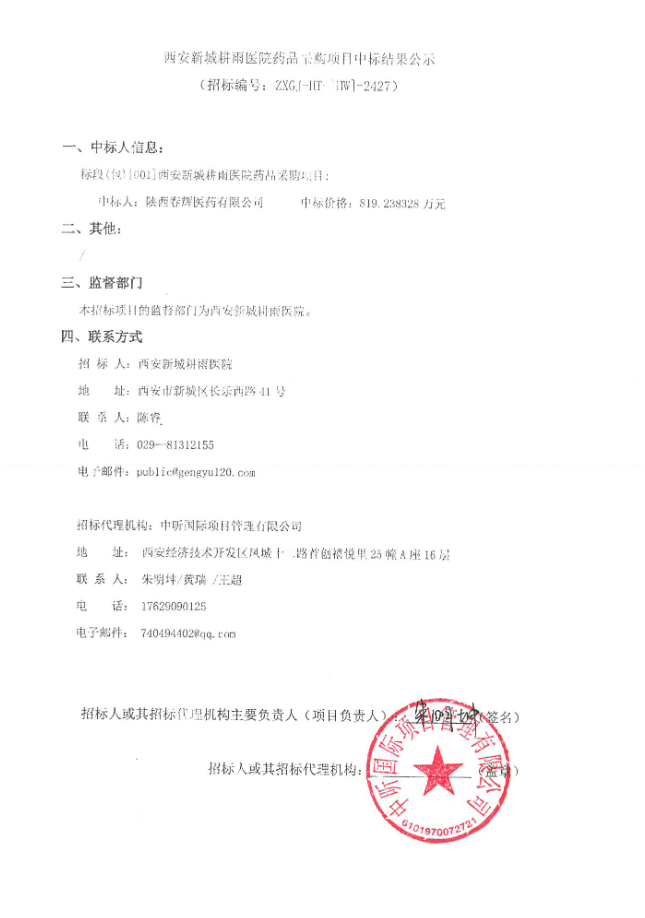 【西安新城耕雨医院】陕西省西安新城耕雨医院药品采购项目中标结果公示