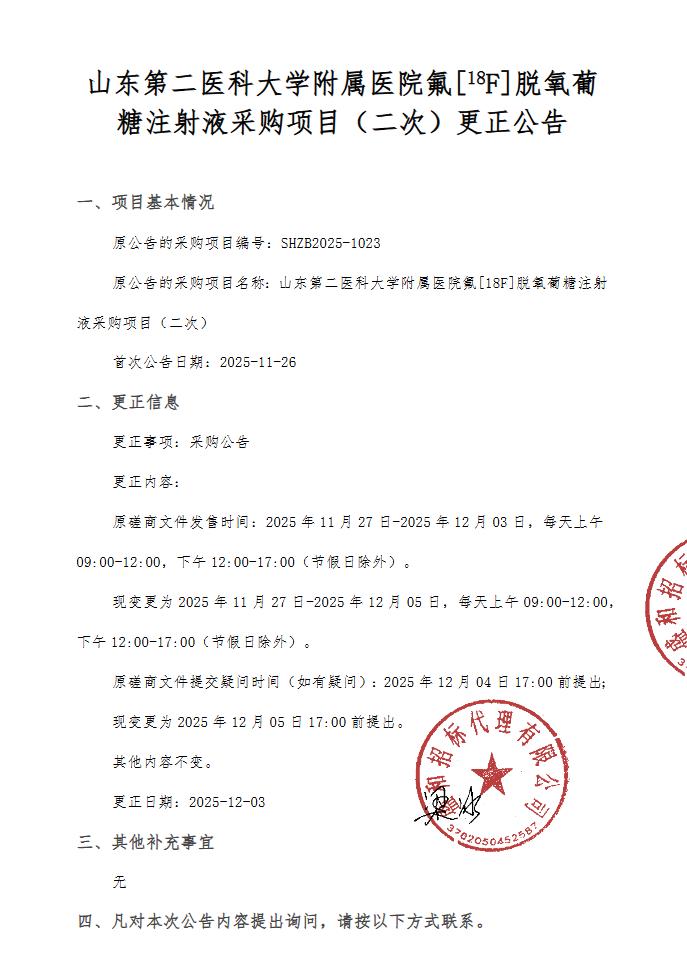 【山东第二医科大学附属医院】山东第二医科大学附属医院氟〔18F〕脱氧葡糖注射液采购项目(二次)更正公告