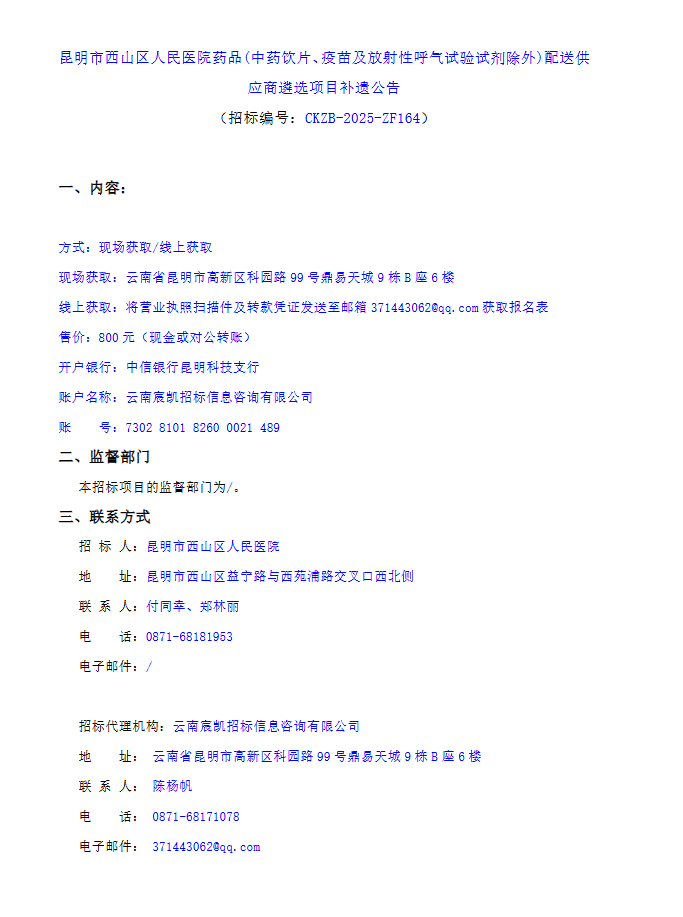 【昆明市西山区人民医院】云南省昆明市西山区人民医院药品(中药饮片、疫苗及放射性呼气试验试剂除外)配送供应商遴选项目补遗公告