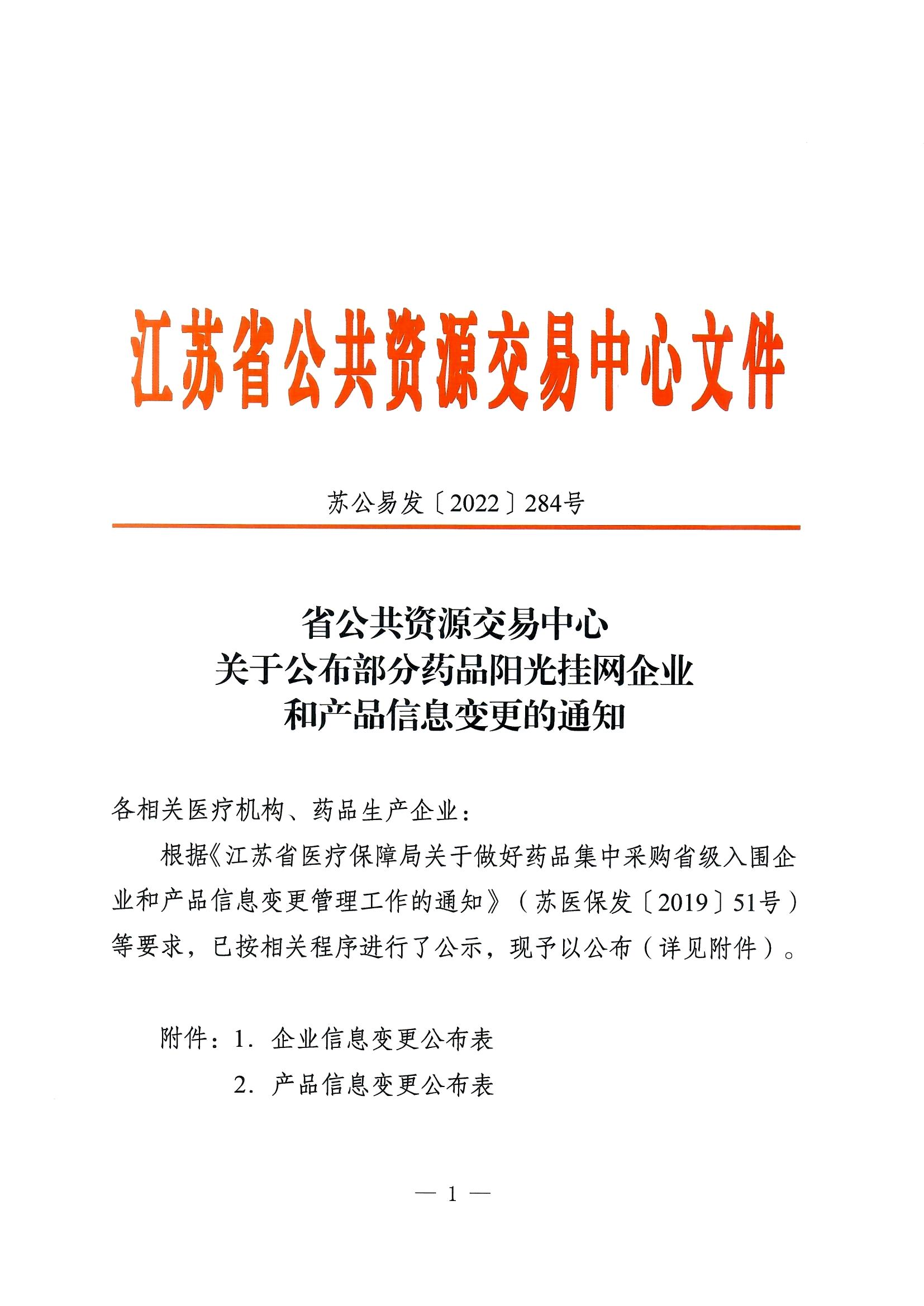 【江苏】省公共资源交易中心关于公布部分药品阳光挂网企业和产品信息变更的通知