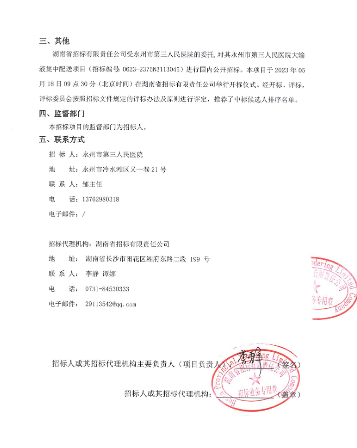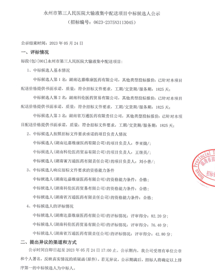 【永州市第三人民医院】湖南省永州市第三人民医院大输液集中配送项目中标候选人公示