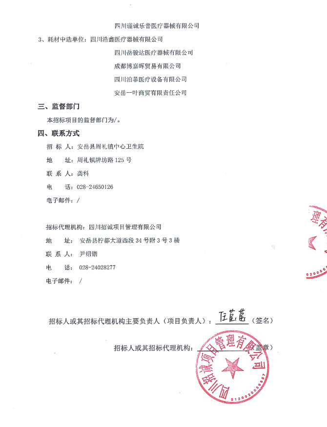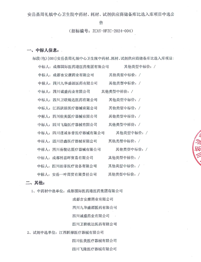 【资阳市安岳县周礼镇中心卫生院】四川省资阳市安岳县周礼镇中心卫生院中药材、耗材、试剂供应商储备库比选入库项目中选公告