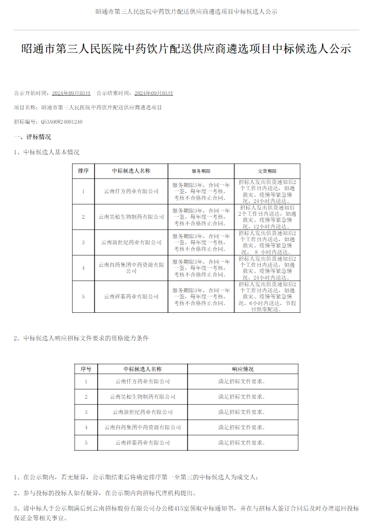 【昭通市第三人民医院】云南省昭通市第三人民医院中药饮片配送供应商遴选项目中标候选人公示