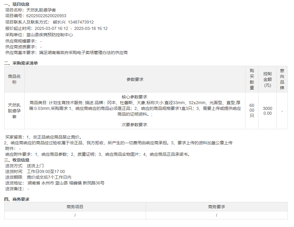 【永州市蓝山县疾病预防控制中心】天然乳胶避孕套竞价公告