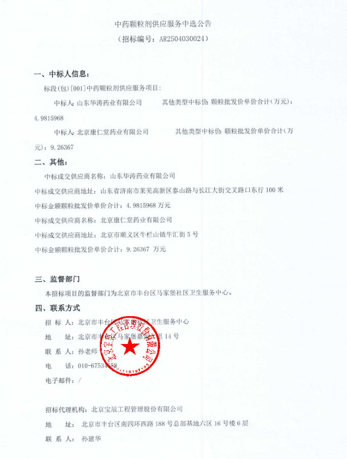 【北京市丰台区马家堡社区卫生服务中心】北京市丰台区马家堡社区卫生服务中心中药颗粒剂供应服务中选公告