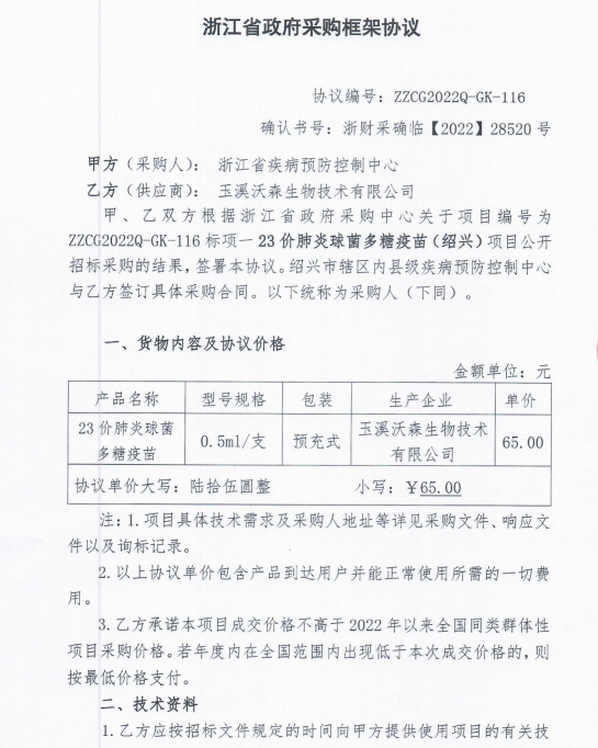 【浙江省疾病预防控制中心】浙江省疾病预防控制中心2022年群体性预防接种23价肺炎球菌多糖疫苗(绍兴市)的合同