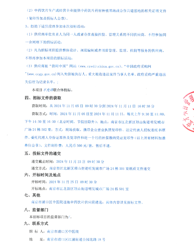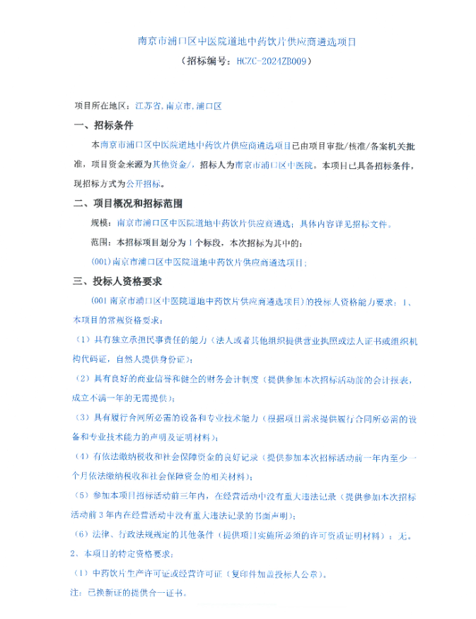 【南京市浦口区中医院】江苏省南京市浦口区中医院道地中药饮片供应商遴选项目