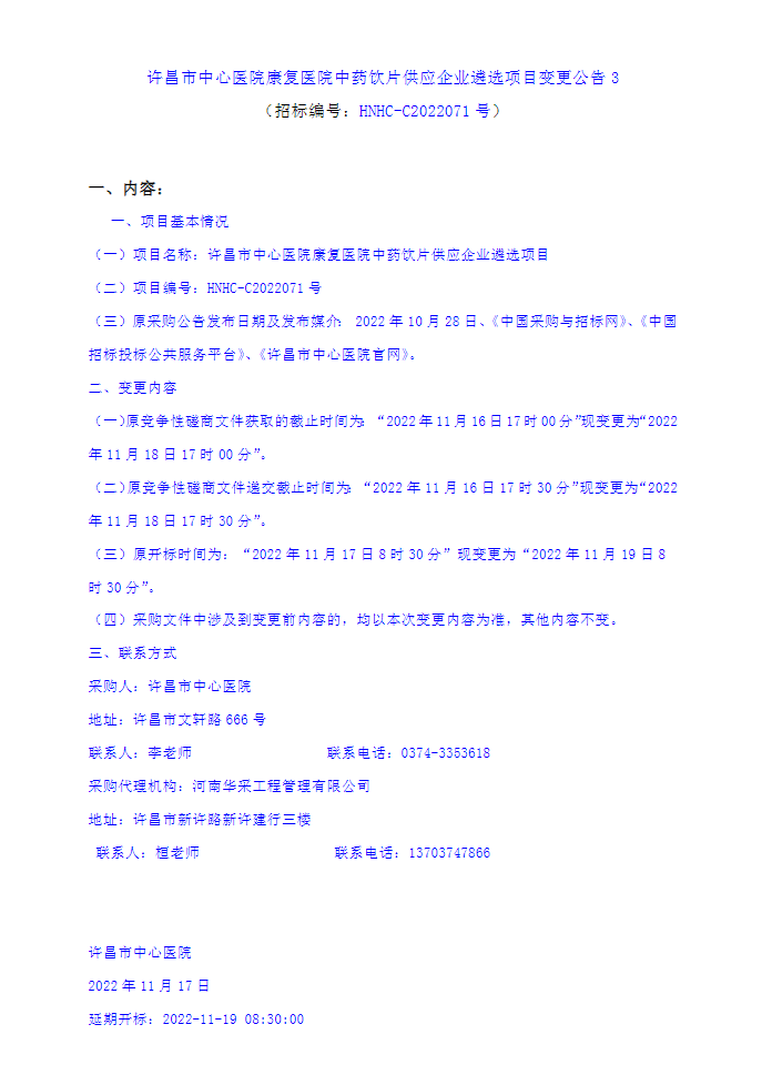 【许昌市中心医院】河南省许昌市中心医院康复医院中药饮片供应企业遴选项目变更公告3