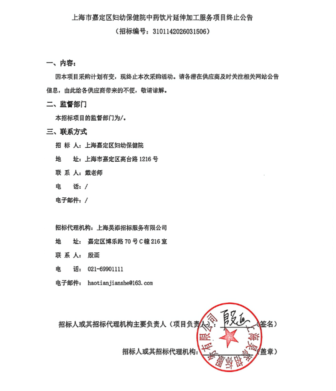 【上海市嘉定区妇幼保健院】上海市嘉定区妇幼保健院中药饮片延伸加工服务项目终止公告