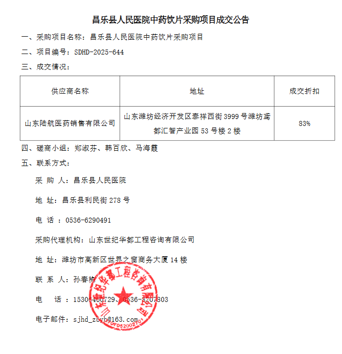 【潍坊市昌乐县人民医院】山东省潍坊市昌乐县人民医院中药饮片采购项目成交公告