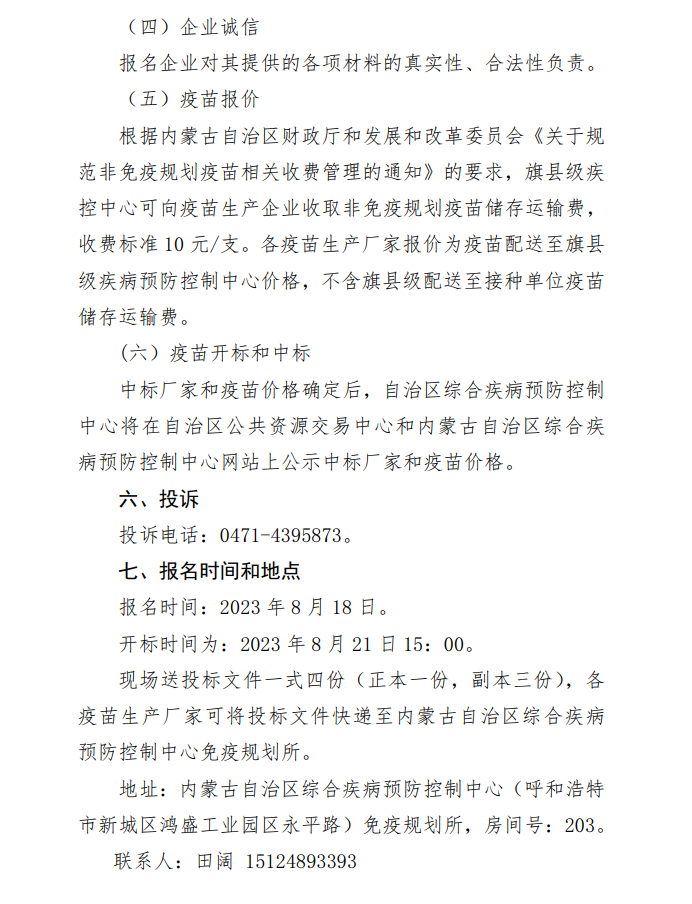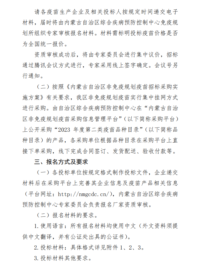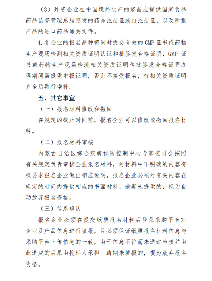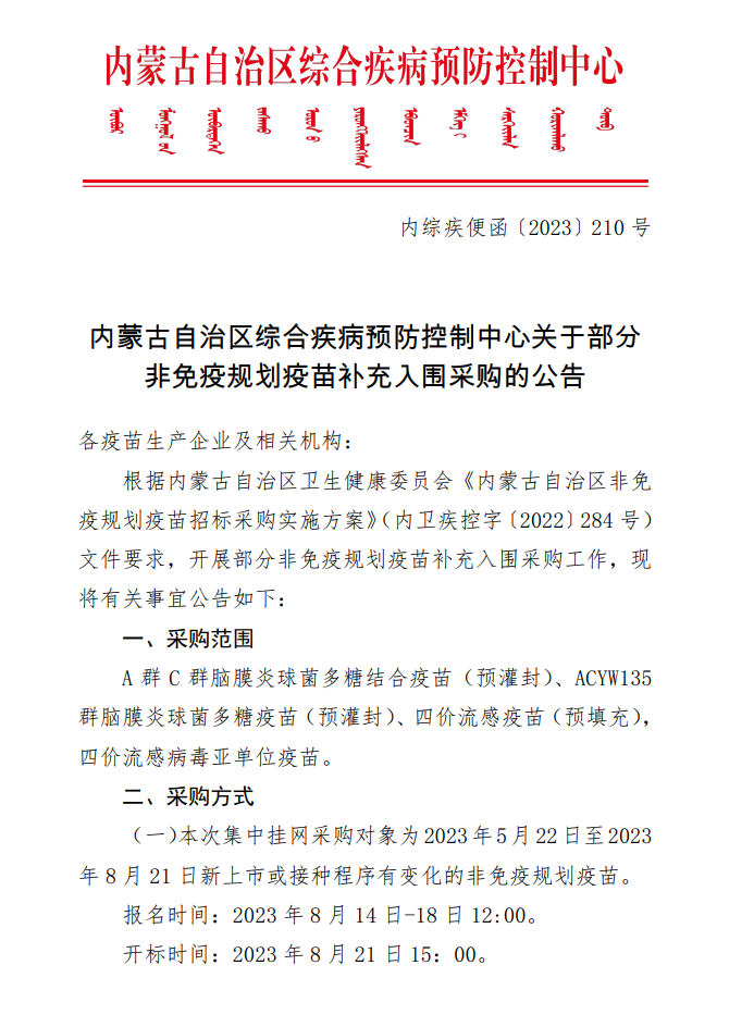 【内蒙】内蒙古自治区综合疾病预防控制中心关于部分非免疫规划疫苗补充入围采购的公告