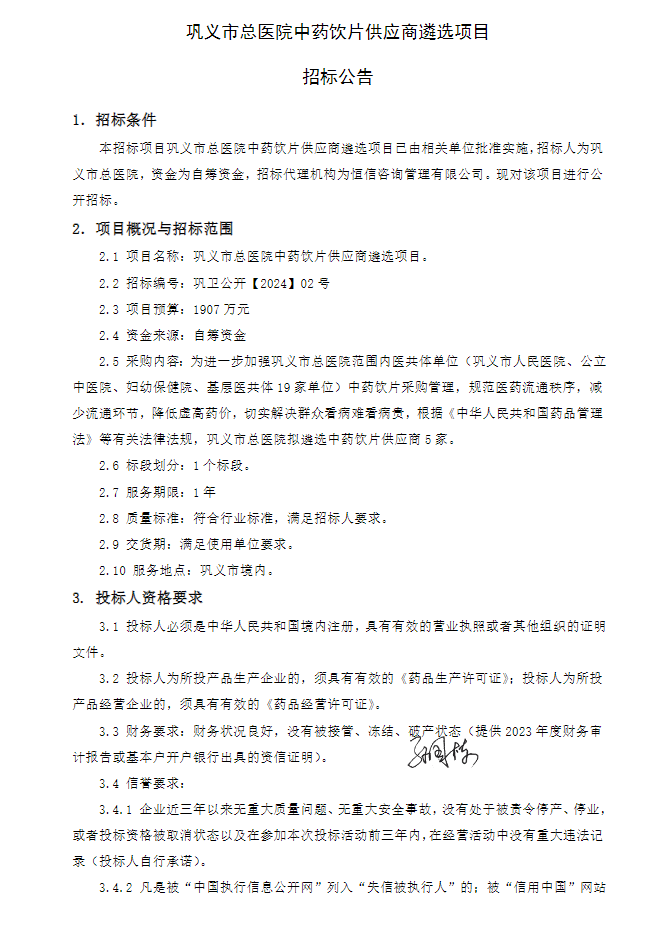 【郑州市巩义市总医院】河南省郑州市巩义市总医院中药饮片供应商遴选项目招标公告