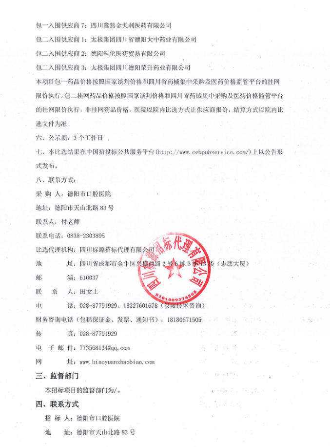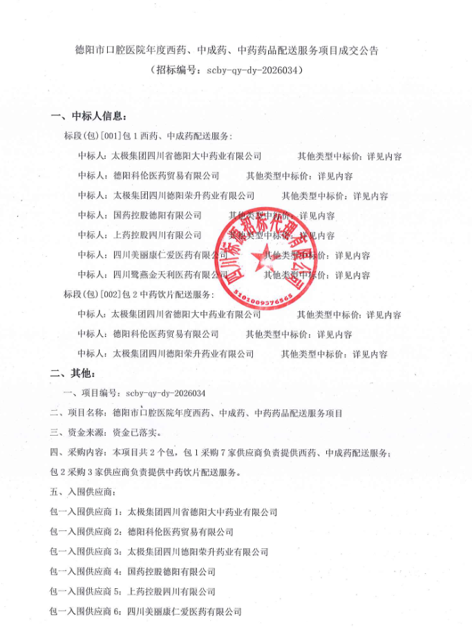 【德阳市口腔医院】四川省德阳市口腔医院年度西药、中成药、中药药品配送服务项目成交公告