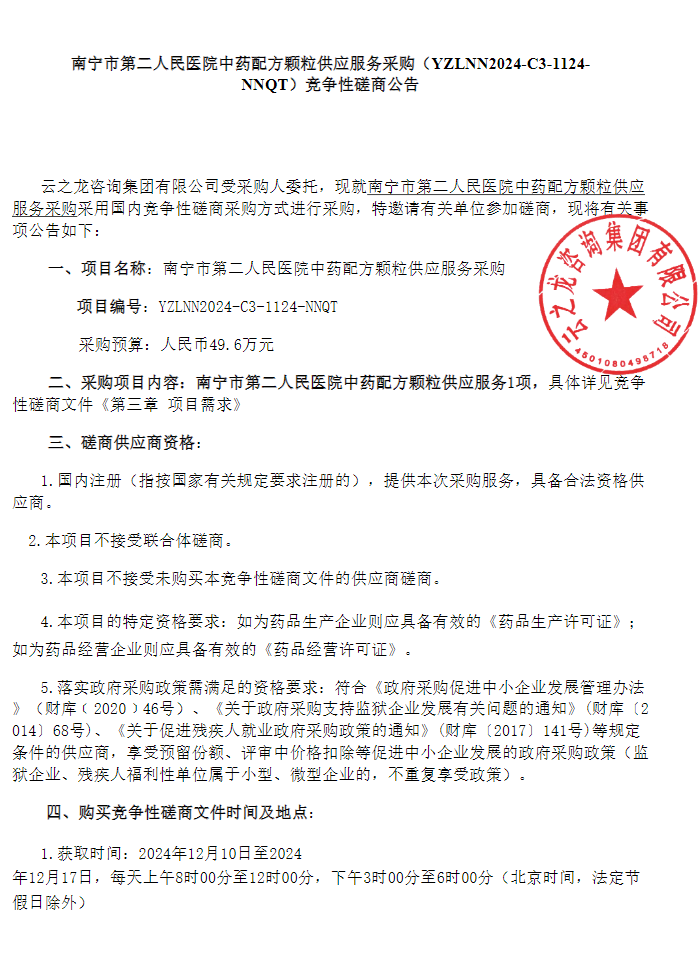 【南宁市第二人民医院】广西壮族自治区南宁市第二人民医院中药配方颗粒供应服务采购(YZLNN2024-C3-1124-NNQT)竞争性磋商公告