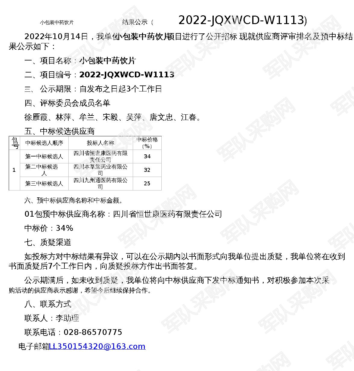 【军队采购网】小包装中药饮片结果公示(2022-JQXWCD-W1113)