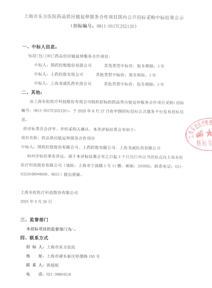 【上海市东方医院】上海市东方医院药品供应链延伸服务合作项目国内公开招标采购中标结果公示