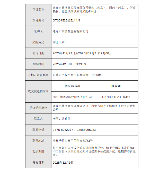 【通辽市蒙济堂医院有限公司】内蒙古自治区通辽市蒙济堂医院有限公司蒙药(药品)、西药(药品)、医疗耗材、检验试剂供应商采购候选人公示4