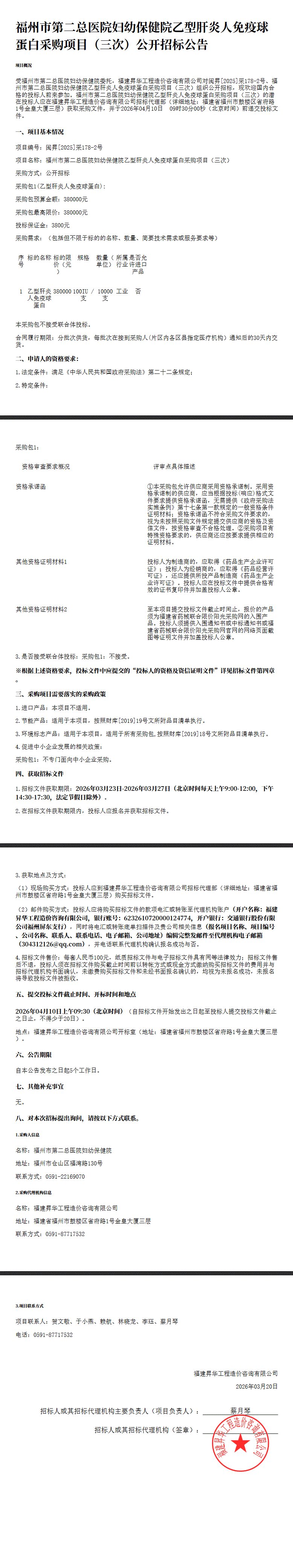 【福州市第二总医院妇幼保健院】福建省福州市第二总医院妇幼保健院乙型肝炎人免疫球蛋白采购项目(三次)公开招标公告