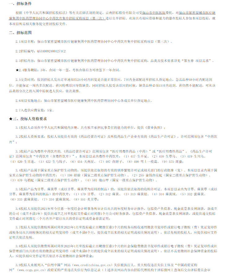 【保山市中医医院】云南省保山市紧密型城市医疗健康集团中医药管理协同中心中药饮片集中招标采购项目(第三次)招标公告