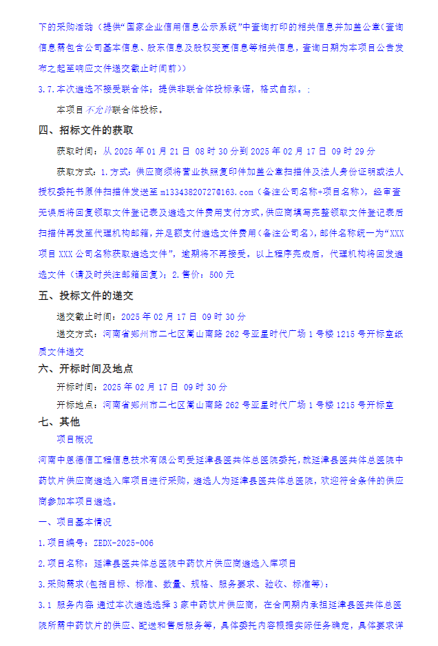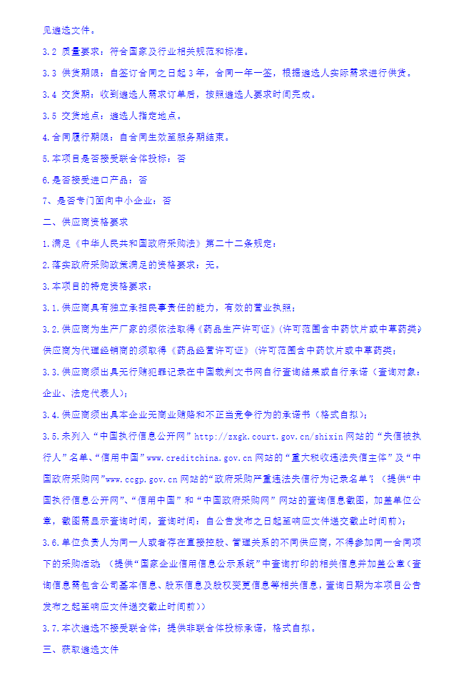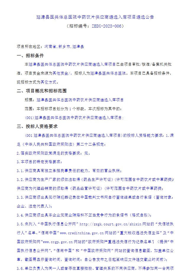 【新乡市延津县医共体总医院】河南省新乡市延津县医共体总医院中药饮片供应商遴选入库项目遴选公告