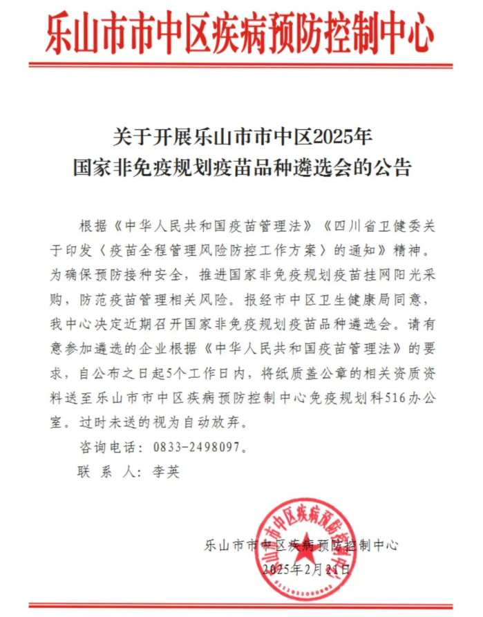 【乐山】关于开展乐山市市中区2025年国家非免疫规划疫苗品种遴选会的公告