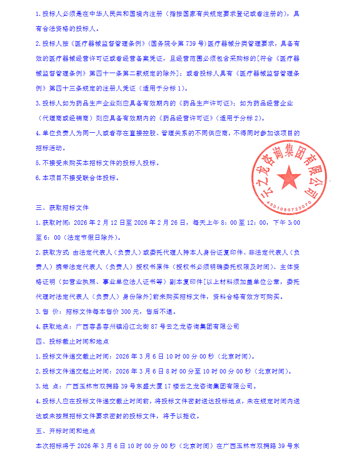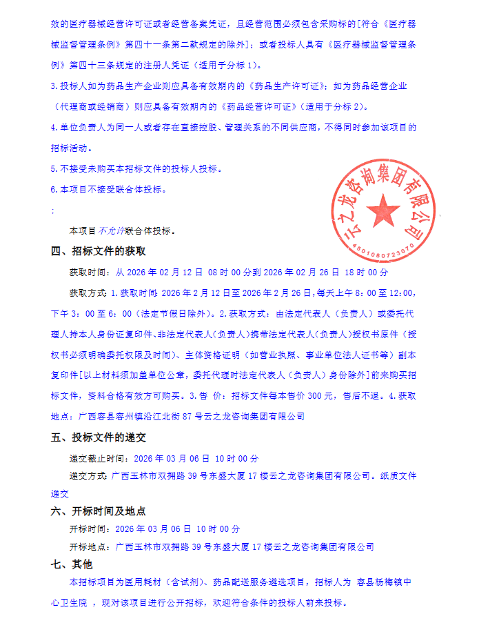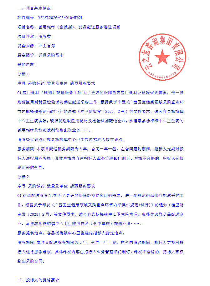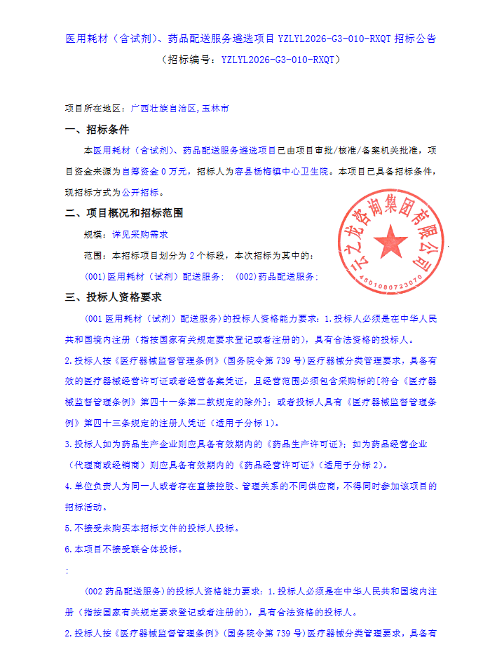 【玉林市容县杨梅镇中心卫生院】广西壮族自治区玉林市容县杨梅镇中心卫生院医用耗材(含试剂)、药品配送服务遴选项目YZLYL2026-G3-010-RXQT招标公告