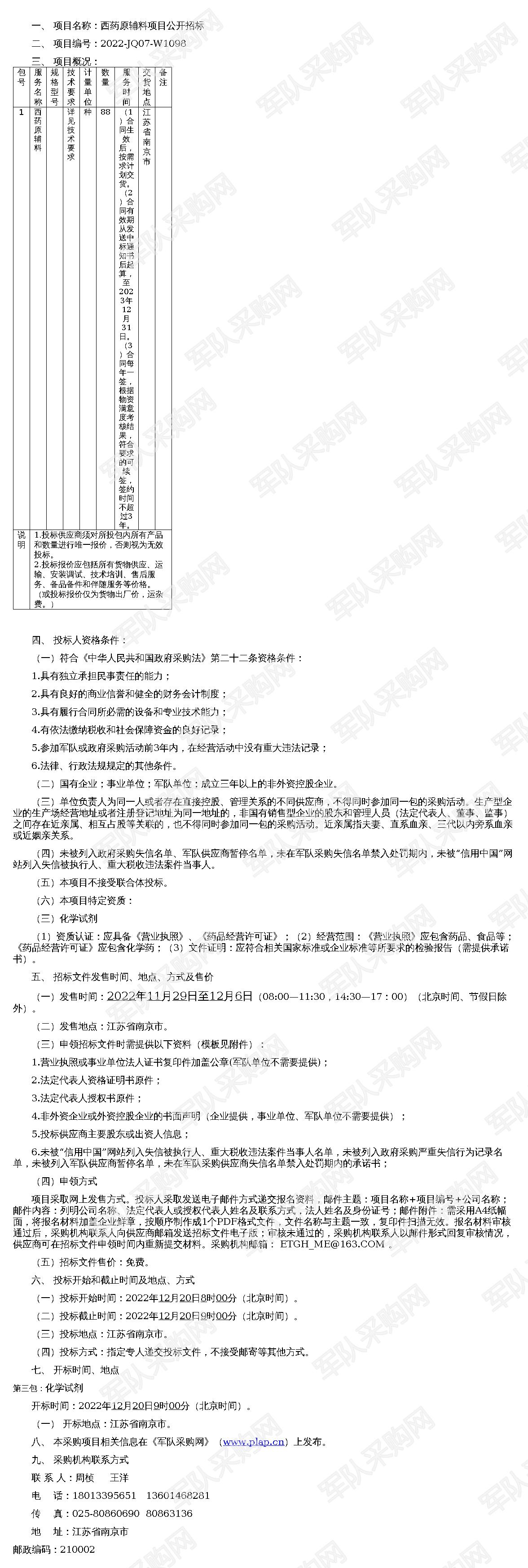 【军队采购】军队采购网西药原辅料项目公开招标(2022-JQ07-W1098)