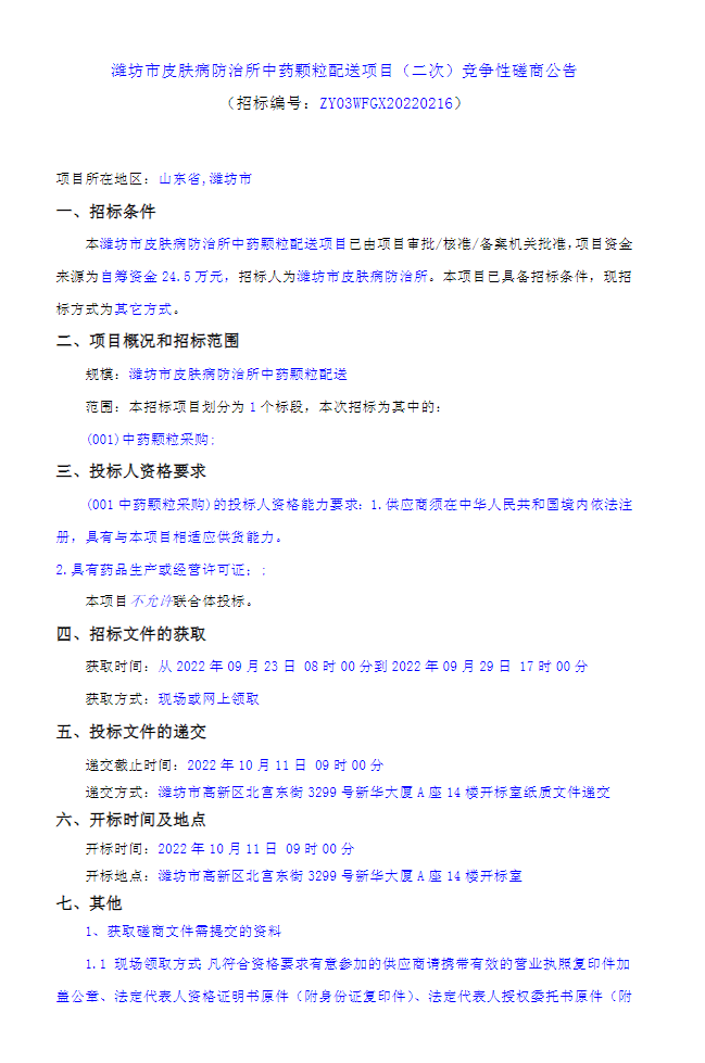 【山东省潍坊市皮肤病防治所】中药颗粒配送项目(二次)竞争性磋商公告
