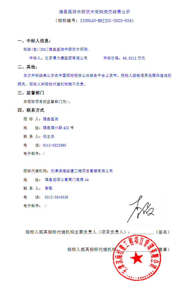 【保定市雄县医院】河北省雄县医院中药饮片采购成交结果公示