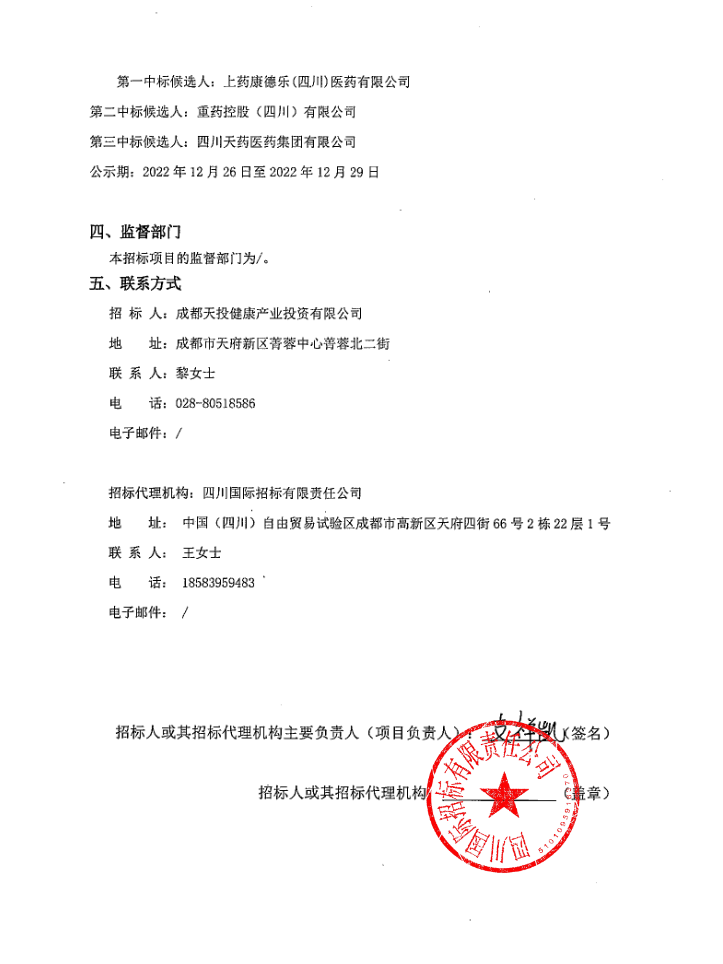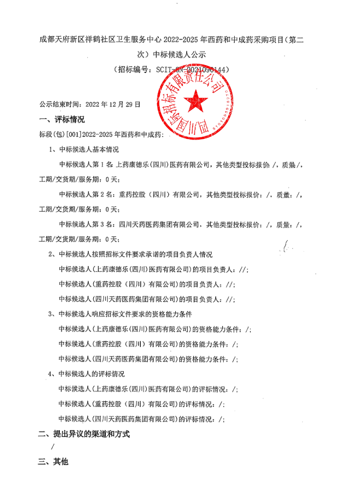 【成都天府新区祥鹤社区卫生服务中心】四川省成都天府新区祥鹤社区卫生服务中心2022-2025年西药和中成药采购项目(第二次)中标候选人公示