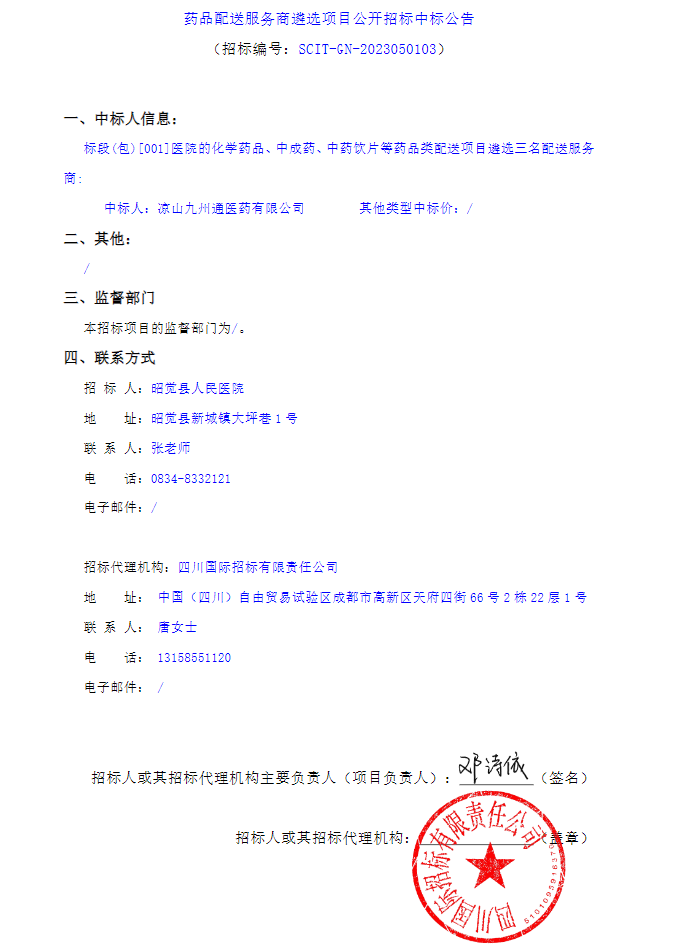 【凉山彝族自治州昭觉县人民医院】四川省凉山彝族自治州昭觉县人民医院药品配送服务商遴选项目公开招标中标公告