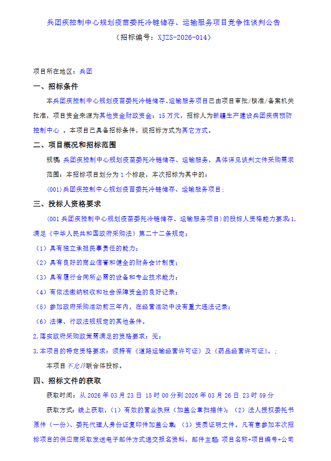 【新疆生产建设兵团疾病预防控制中心】新疆生产建设兵团疾控制中心规划疫苗委托冷链储存、运输服务项目竞争性谈判公告