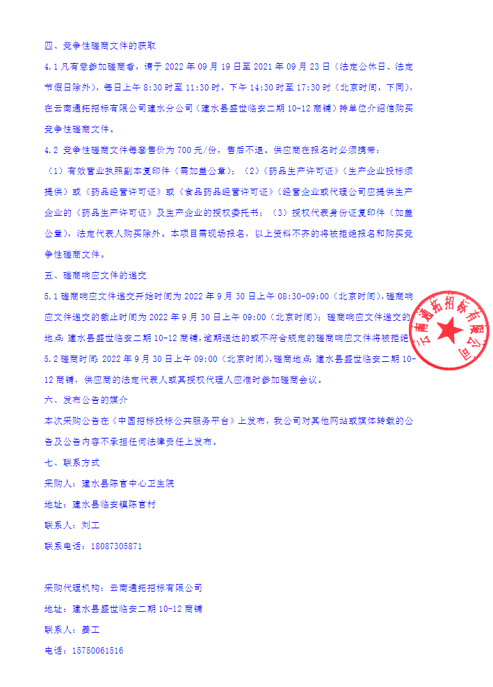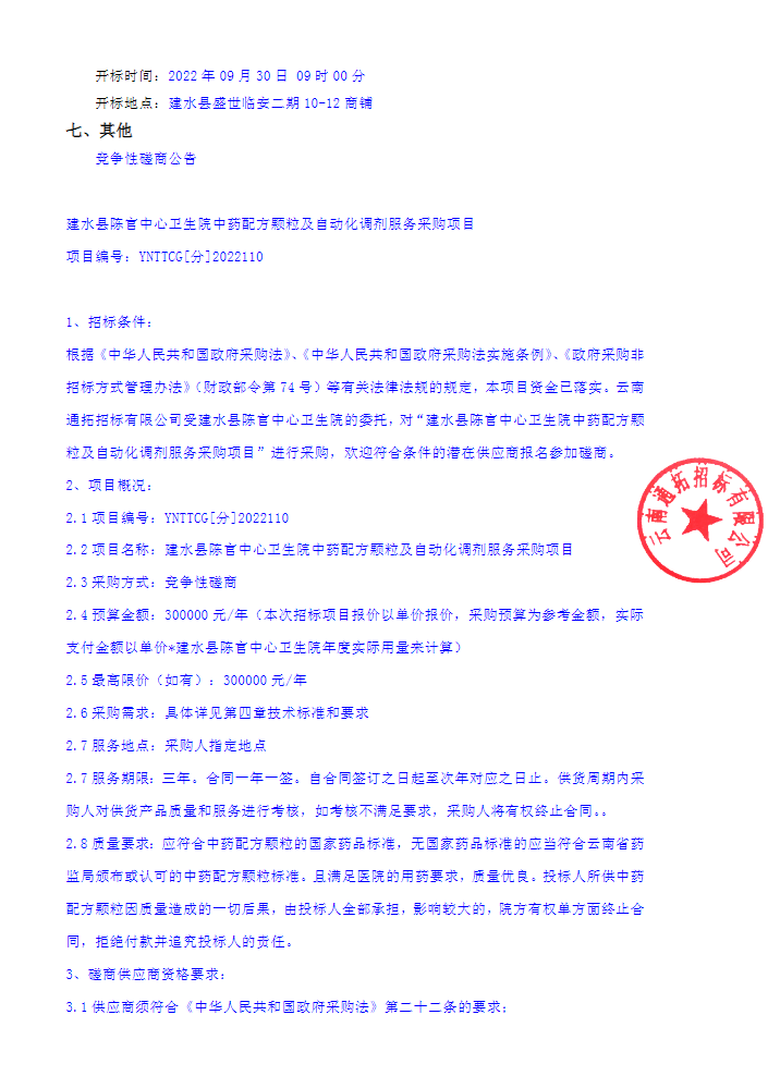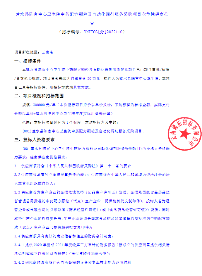 【云南省红河哈尼族彝族自治州建水县陈官中心卫生院】中药配方颗粒及自动化调剂服务采购项目竞争性磋商公告
