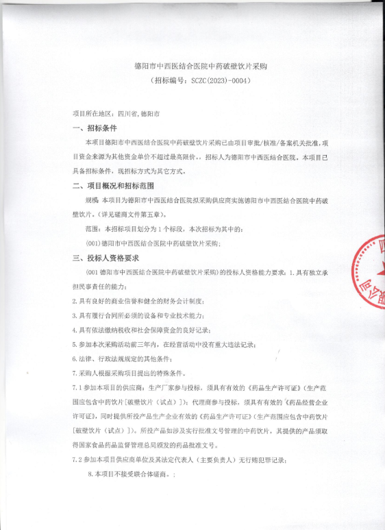 【德阳市中西医结合医院】四川省德阳市中西医结合医院中药破壁饮片采购