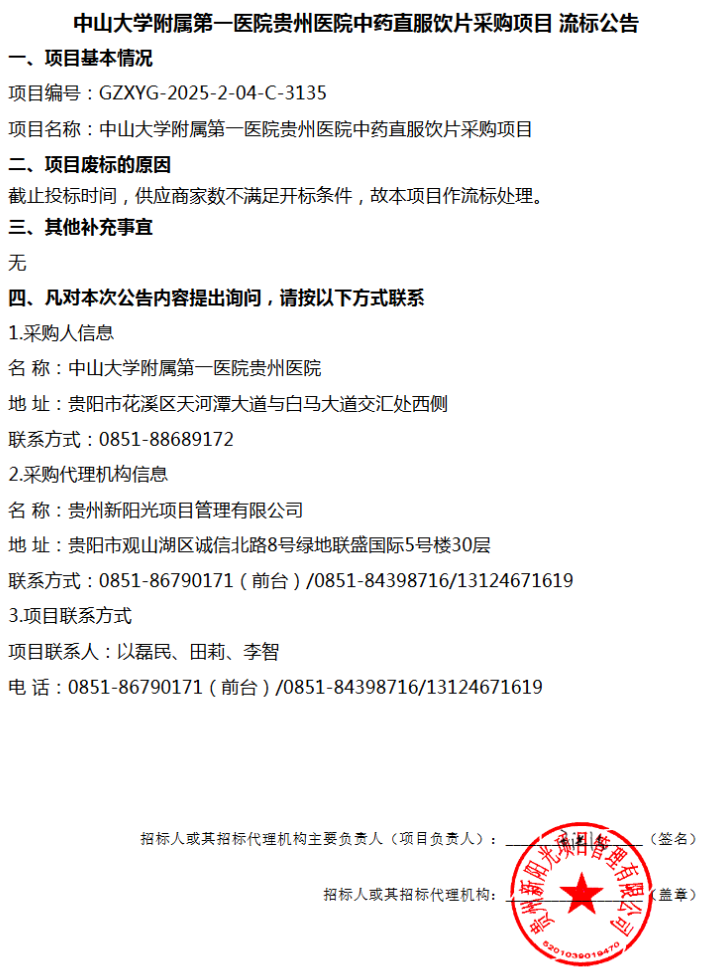 【中山大学附属第一医院贵州医院】贵州省中山大学附属第一医院贵州医院中药直服饮片采购项目流标公告