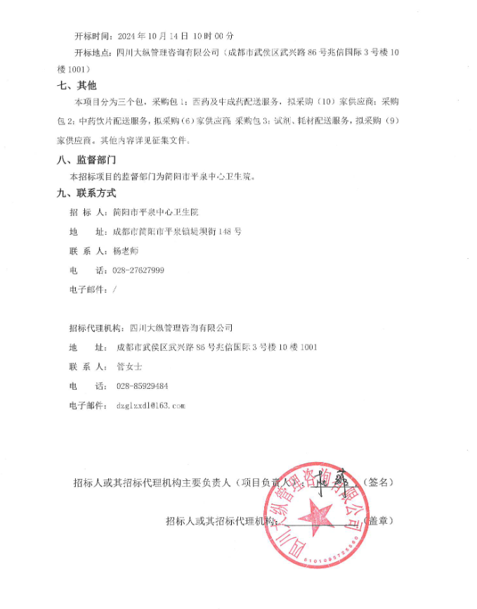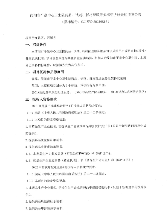 【成都市简阳市平泉中心卫生院】四川省成都市简阳市平泉中心卫生院药品、试剂、耗材配送服务框架协议采购征集公告