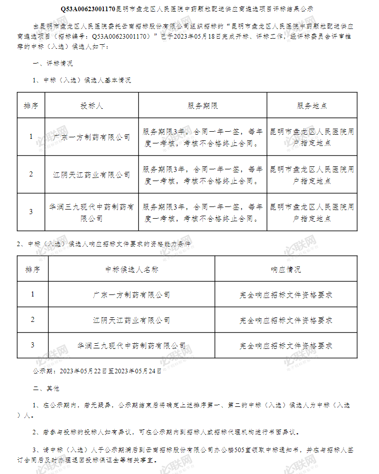 【昆明市盘龙区人民医院】云南省昆明市盘龙区人民医院中药颗粒配送供应商遴选项目招标评标公示